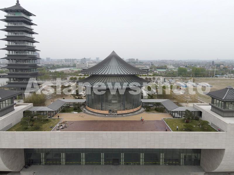 2021年4月14日拍摄的扬州中国大运河博物馆。经过一年多的建设,位于江苏扬州运河三湾风景区内的扬州中国大运河博物完成主体建筑外墙装饰建设,进入内部装修的施工冲刺阶段。