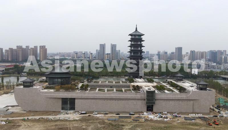 2021年4月14日拍摄的扬州中国大运河博物馆。经过一年多的建设,位于江苏扬州运河三湾风景区内的扬州中国大运河博物完成主体建筑外墙装饰建设,进入内部装修的施工冲刺阶段。