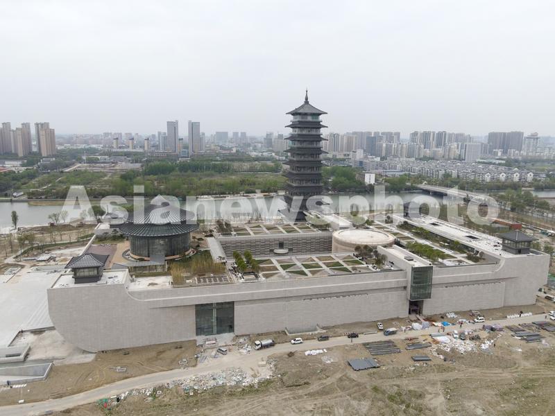 2021年4月14日拍摄的扬州中国大运河博物馆。经过一年多的建设,位于江苏扬州运河三湾风景区内的扬州中国大运河博物完成主体建筑外墙装饰建设,进入内部装修的施工冲刺阶段。