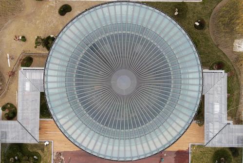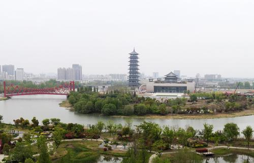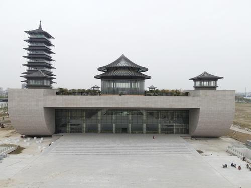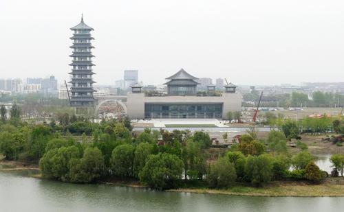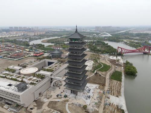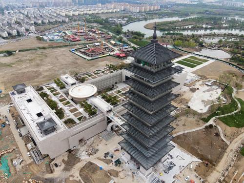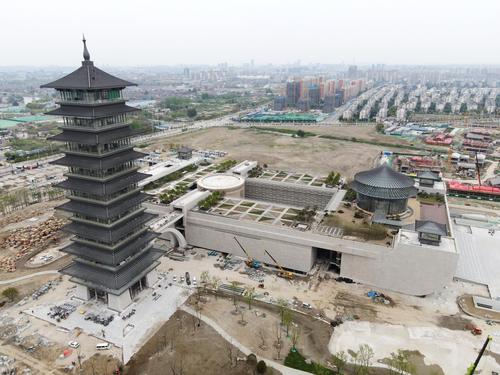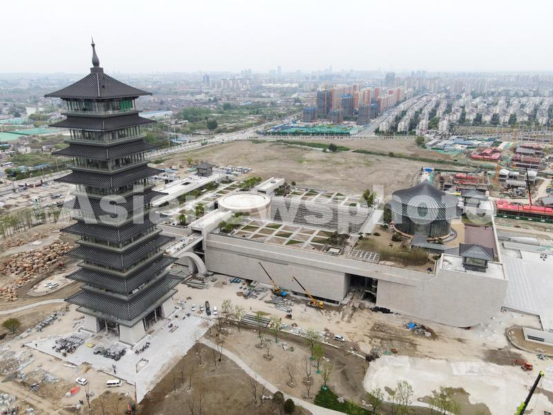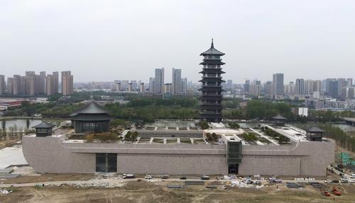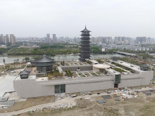 2021年4月14日拍摄的扬州中国大运河博物馆。经过一年多的建设,位于江苏扬州运河三湾风景区内的扬州中国大运河博物完成主体建筑外墙装饰建设,进入内部装修的施工冲刺阶段。