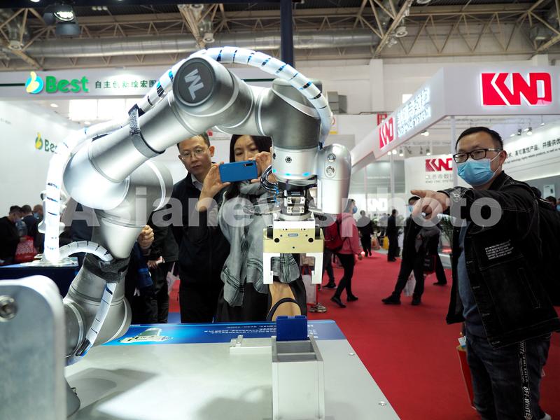 2021年4月13日,在北京中国国际展览中心(新馆)举办的第十七届中国国际机床展览会上,观众在参观展会。