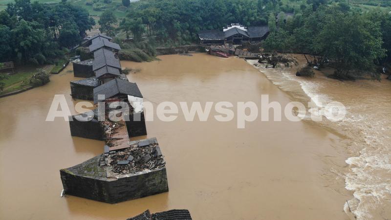 图片说明:2020年7月8日,彩虹桥受洪水冲击,发生局部坍塌。一侧桥面被冲毁,有一个桥墩也有部分损毁。