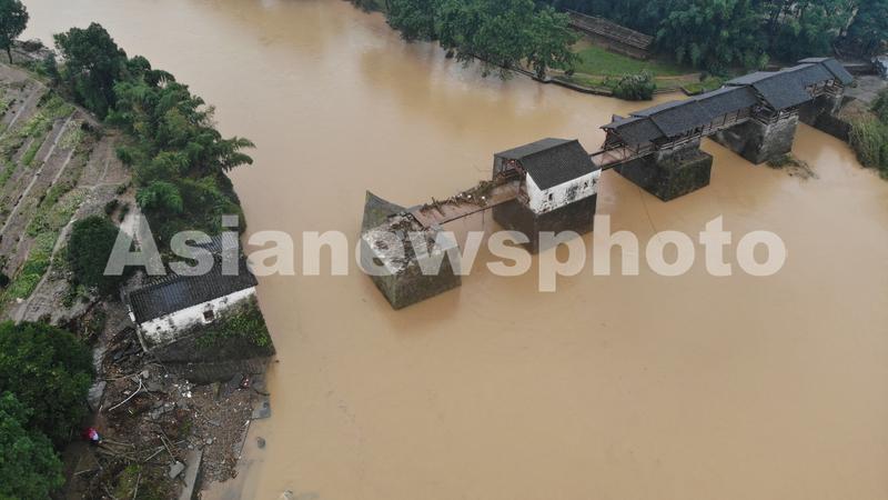 图片说明:2020年7月8日,彩虹桥受洪水冲击,发生局部坍塌。一侧桥面被冲毁,有一个桥墩也有部分损毁。