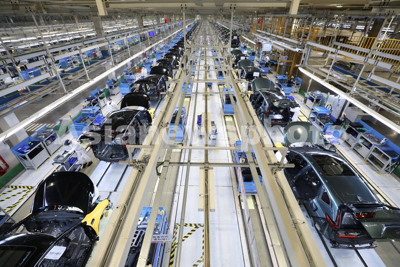 2021年4月15日,湖北武汉,东风本田汽车第三工厂总装生产线上,工人在忙碌。