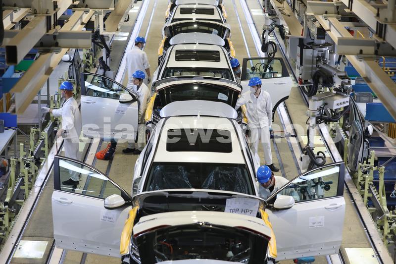 2021年4月15日,湖北武汉,东风本田汽车第三工厂总装生产线上,工人在忙碌。