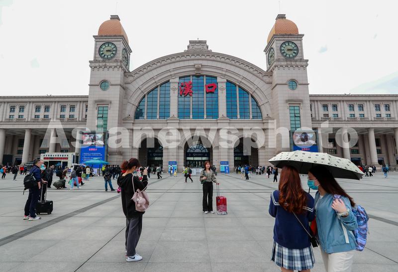 4月22日,游客在汉口火车站广场拍摄纪念。