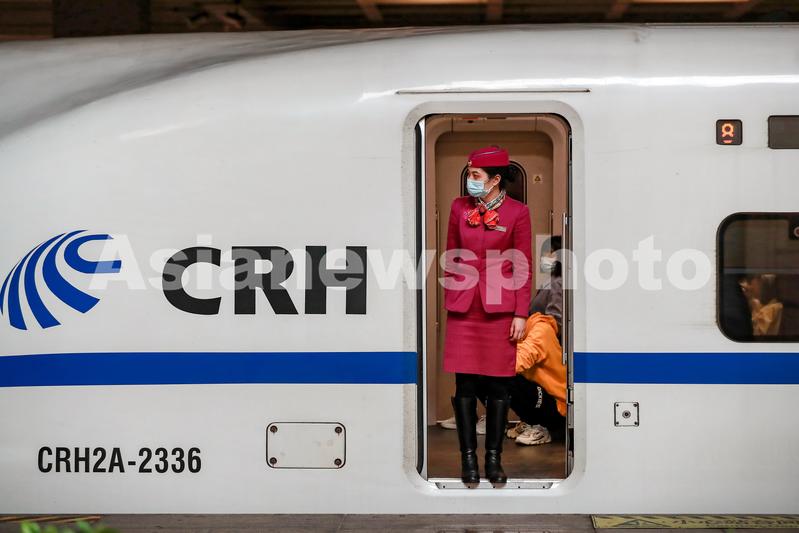 4月22日,高铁列车工作人员在动车组门口等侯发车。