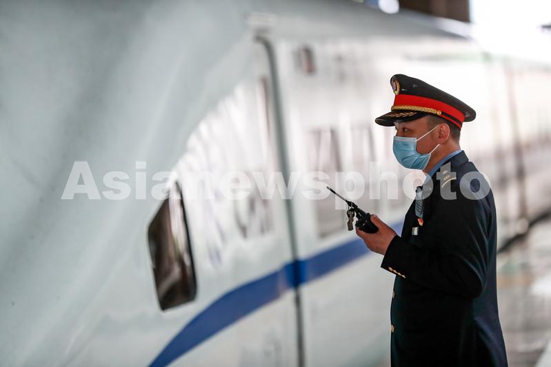 4月22日,汉口火车站工作人员做好护送动车组列车驶出车站准备。