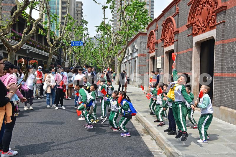 2021年4月28日,上海,市民游客在中共一大会址前打卡合影。近日,上海中共一大会址完成修缮,将于今年“七一”前对外开放。尽管中共一大纪念馆目前仍未开放,还需要进行内部细节的调整,但每天仍有不少市民游客前来打卡合影。