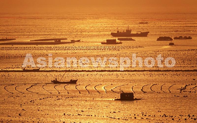 图片说明:2021年4月29日,辽宁省大连市长海县广鹿岛镇渔民们驾船迎着初升的朝阳前往养殖区进行作业。