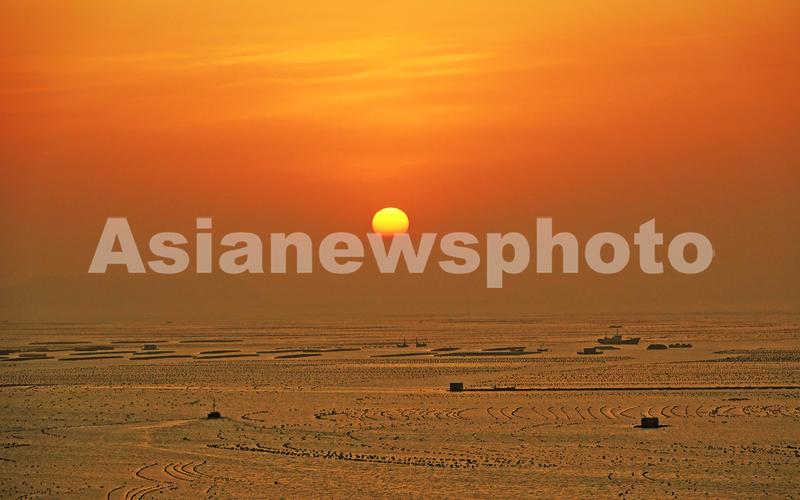 图片说明:2021年4月29日,辽宁省大连市长海县广鹿岛镇渔民们驾船迎着初升的朝阳前往养殖区进行作业。