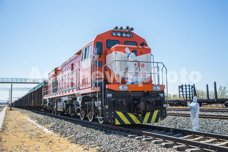 图片说明:2021年4月28日,二连出入境边防检查站民警对出境中欧班列进行车体检查。
