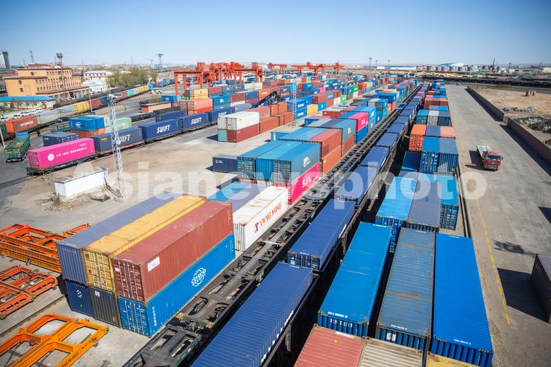 图片说明:2021年4月29日,二连浩特铁路货场内等待出境的中欧班列集装箱。