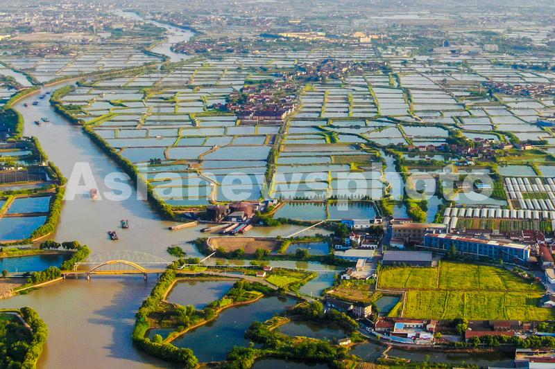 图片说明:2021年5月1日,浙江省湖州市南浔区和孚镇荻港村,千亩桑基鱼塘星罗棋布,高空俯瞰景象绚烂,一派诗情画意。