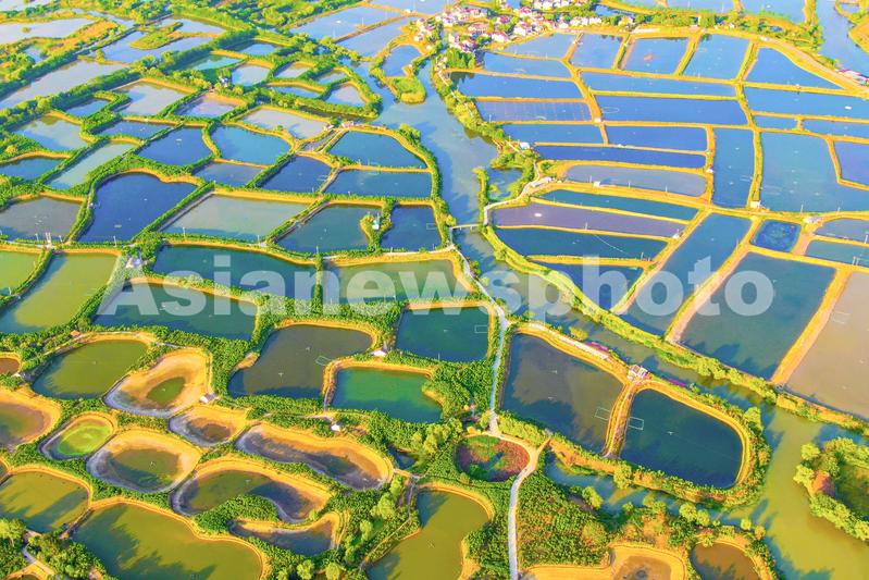 图片说明:2021年5月1日,浙江省湖州市南浔区和孚镇荻港村,千亩桑基鱼塘星罗棋布,高空俯瞰景象绚烂,一派诗情画意。