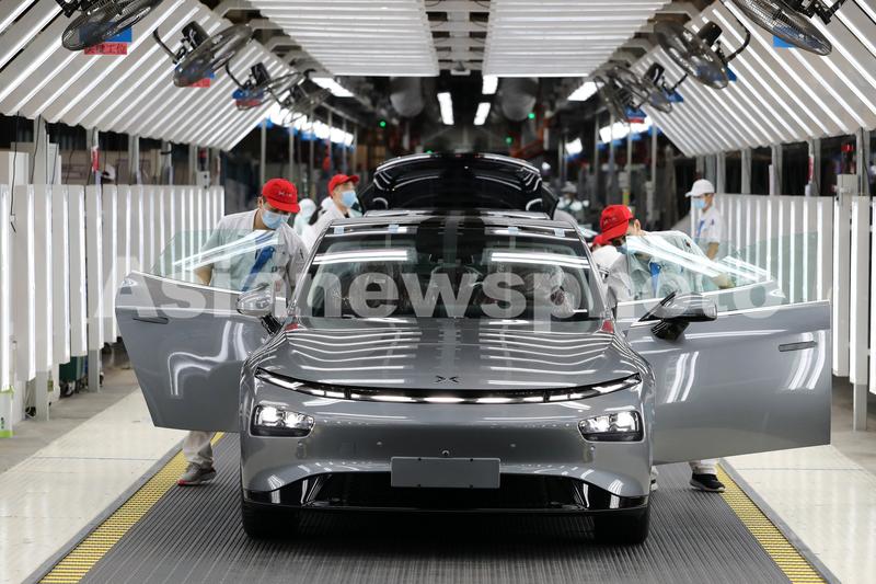 图片说明:4月18日,广东肇庆小鹏汽车生产基地,工人在组装新车。