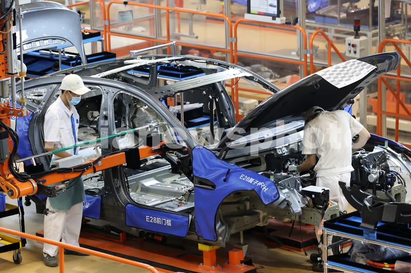 图片说明:4月18日,广东肇庆小鹏汽车生产基地,工人在组装新车。