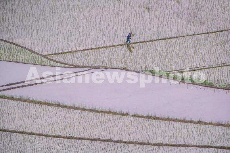 图片说明:2021年5月10日,重庆市南川区南城街道清泉社区居民在补插秧苗。
