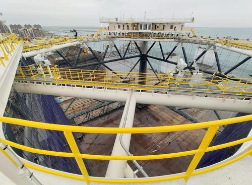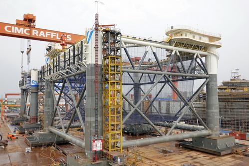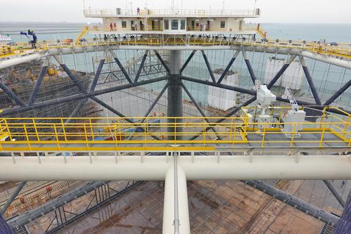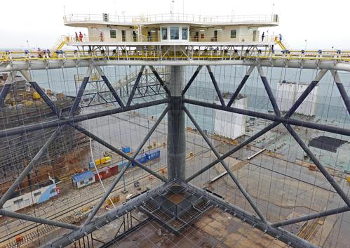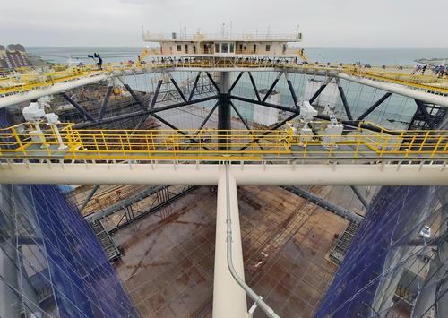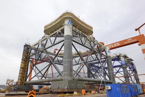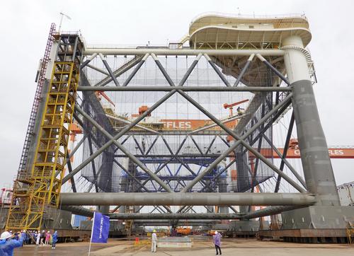 2021年5月16日,在中集来福士山东龙口建造基地,“经海001号”深海智能网箱准备下水。