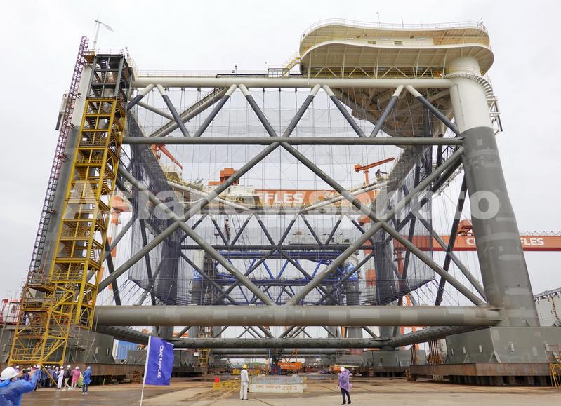 2021年5月16日,在中集来福士山东龙口建造基地,“经海001号”深海智能网箱准备下水。