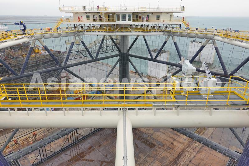 2021年5月16日,在中集来福士山东龙口建造基地,“经海001号”深海智能网箱准备下水。