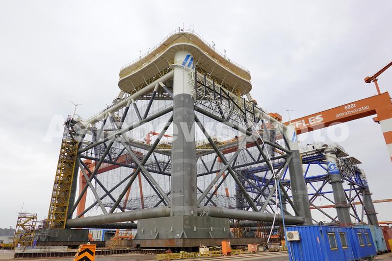 2021年5月16日,在中集来福士山东龙口建造基地,“经海001号”深海智能网箱准备下水。