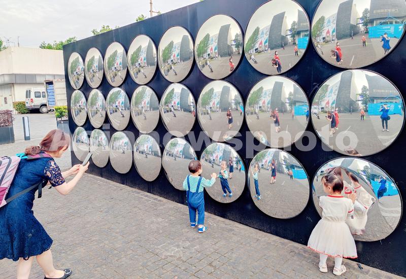 2021年5月18日,上海玻璃博物馆建馆十周年,游客与户外镜子创意装置互动。
