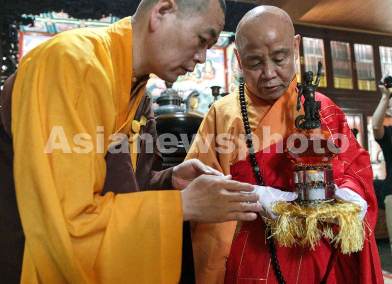 图片说明:5月19日,中国佛教协会会长演觉法师迎请释迦太子圣像。