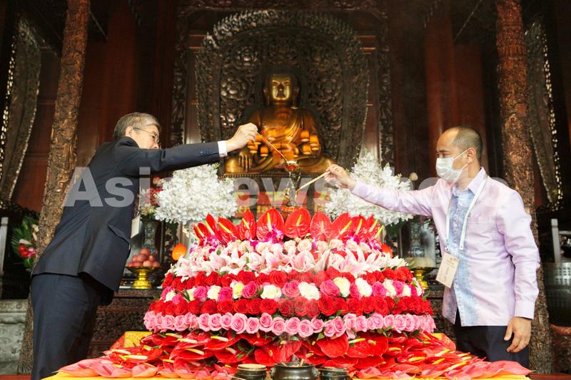 图片说明:5月19日,韩国驻华使馆公使参赞兼韩国文化院院长Kim Jin-gon(左)与柬埔寨王国驻华使馆二等秘书TY LICO浴佛。