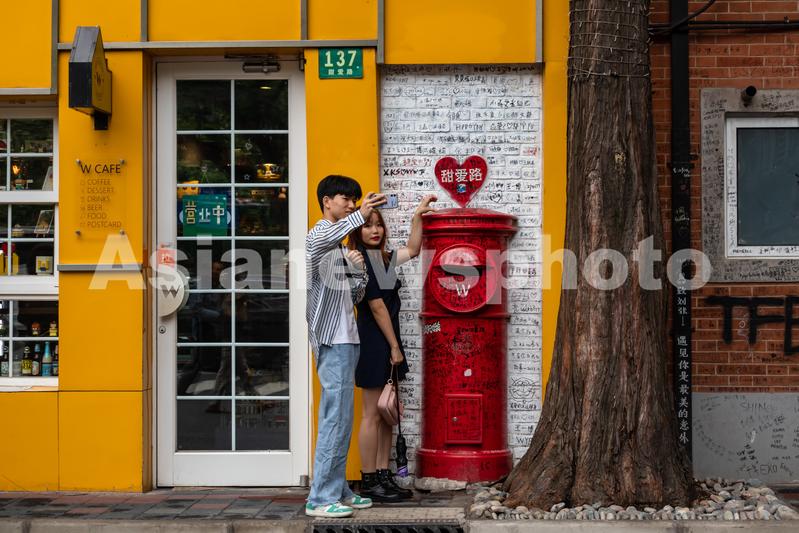 2021年5月20日,上海甜爱路上,情侣前来打卡拍照。