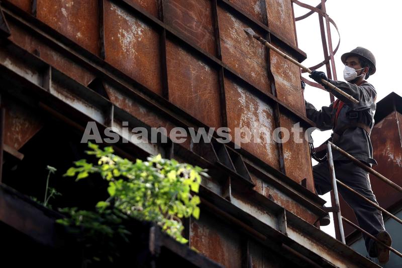 图片说明:2021年5月27日,在合肥东部新中心的马(合)钢高炉区,工人在对遗存工业建构筑物进行防腐、除锈。