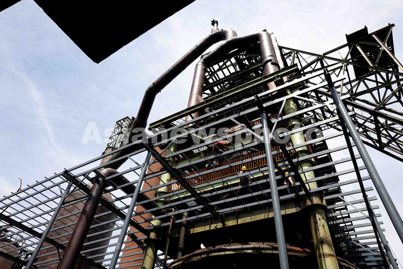 图片说明:2021年5月27日,在合肥东部新中心的马(合)钢高炉区,工人在对遗存工业建构筑物进行钢结构顶棚焊接。