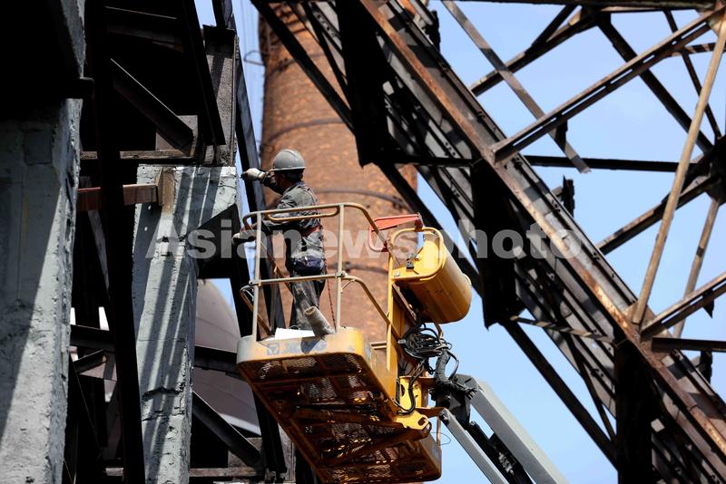 图片说明:2021年5月27日,在合肥东部新中心的马(合)钢高炉区,工人在对遗存工业建构筑物进行涂装。