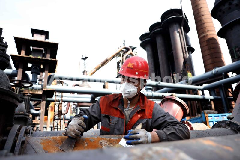 图片说明:2021年5月27日,在合肥东部新中心的马(合)钢高炉区,工人在对遗存工业建构筑物进行防腐、除锈。