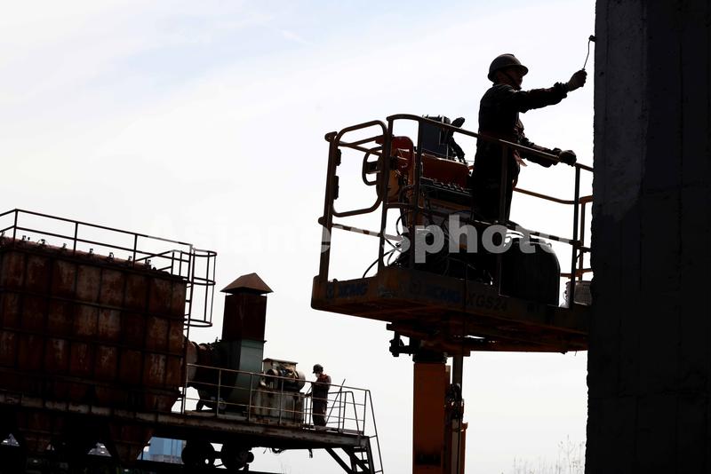 图片说明:2021年5月27日,在合肥东部新中心的马(合)钢高炉区,工人在对遗存工业建构筑物进行防腐、除锈、涂装等专业处理和保护。