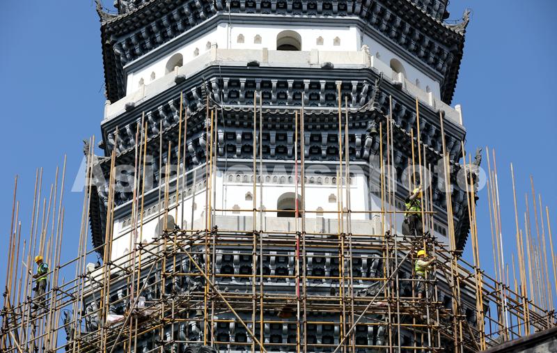 图片说明:5月30日,安徽省安庆市迎江寺振风塔周围架设着脚手架。