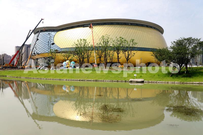 2021年5月30日,浙江杭州拱墅区运河亚运公园里,杭州亚运会乒乓球场馆建设进入冲刺扫尾阶段,施工人员正忙着对场馆外立面进行施工作业。