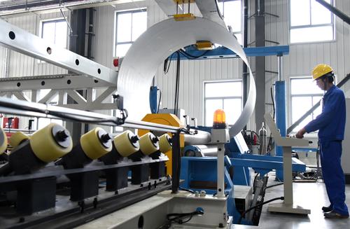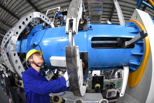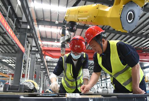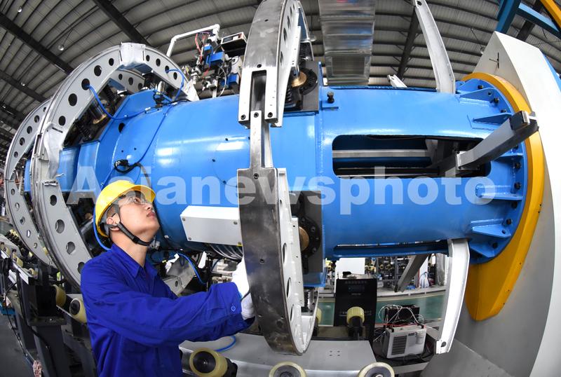2021年6月2日,位于江苏连云港经济技术开发区的连云港中远海运特种装备制造有限公司生产车间,工人正在安装、调试LNG罐箱智能生产线。