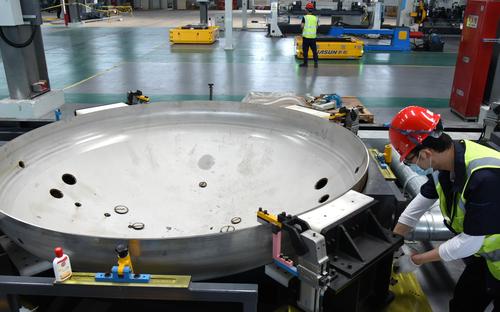 2021年6月2日,位于江苏连云港经济技术开发区的连云港中远海运特种装备制造有限公司生产车间,工人正在安装、调试LNG罐箱智能生产线。正在加紧进行安装和调试的连云港中远海运特装LNG罐箱制造项目总投资12亿元,可年产6000只LNG罐箱,主要用于液化天然气的储存与运输,建成后将是全球第一个LNG罐箱智能化生产工厂,机械自动化程度达80%以上,厂区内零部件的转运、组装、喷涂全都是自动化操作,通过“信息化”系统全面实现管理层面可视化、数据化,最终推动质量、生产、设备等改进,并与经营管理无缝衔接。