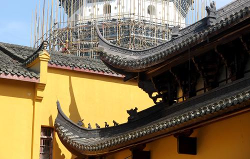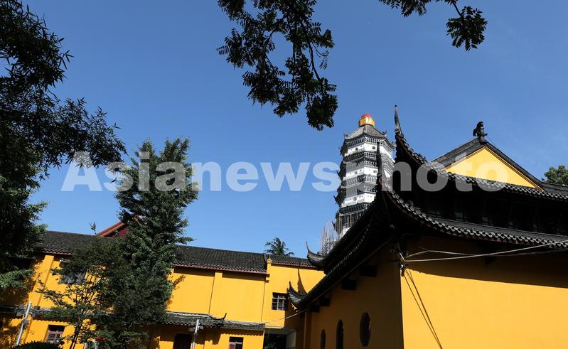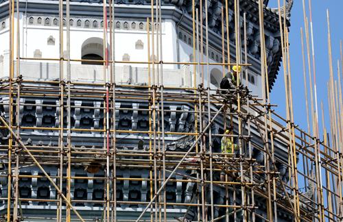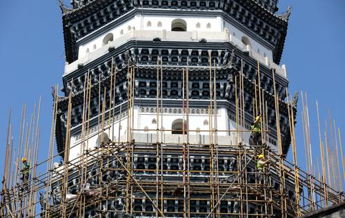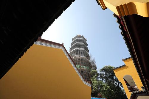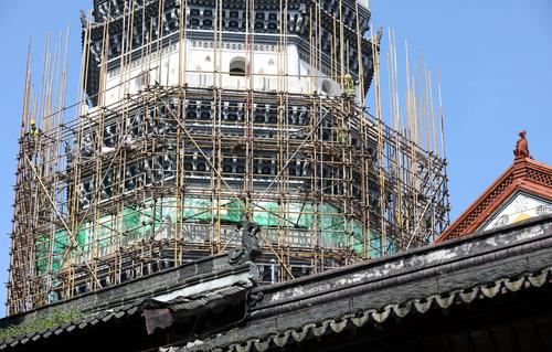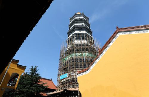 图片说明:5月30日,安徽省安庆市迎江寺振风塔周围架设着脚手架。