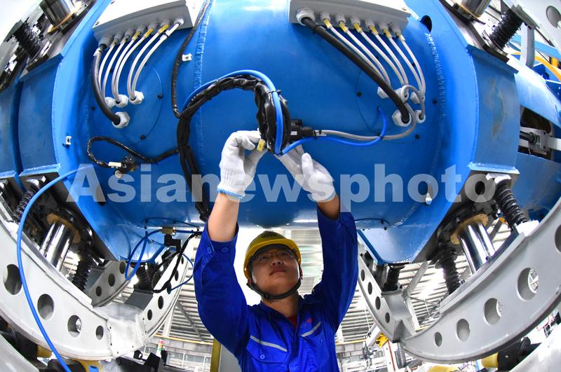 2021年6月2日,位于江苏连云港经济技术开发区的连云港中远海运特种装备制造有限公司生产车间,工人正在安装、调试LNG罐箱智能生产线。
