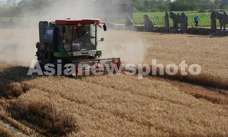 图片说明:2021年6月4日,巩义市芝田镇永裕陵,收割机在陵区里往来穿梭收割小麦。