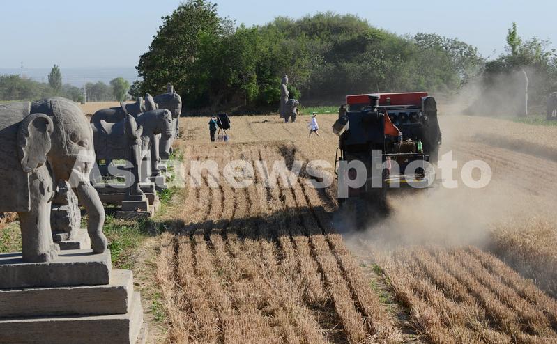2021年6月4日,巩义市芝田镇永裕陵,收割机在陵区里往来穿梭收割小麦。