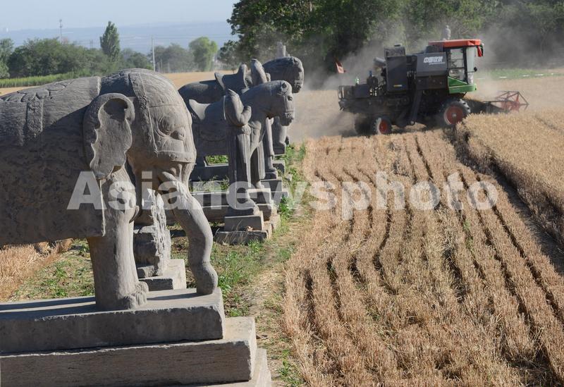 图片说明:2021年6月4日,巩义市芝田镇永裕陵,收割机在陵区里往来穿梭收割小麦。