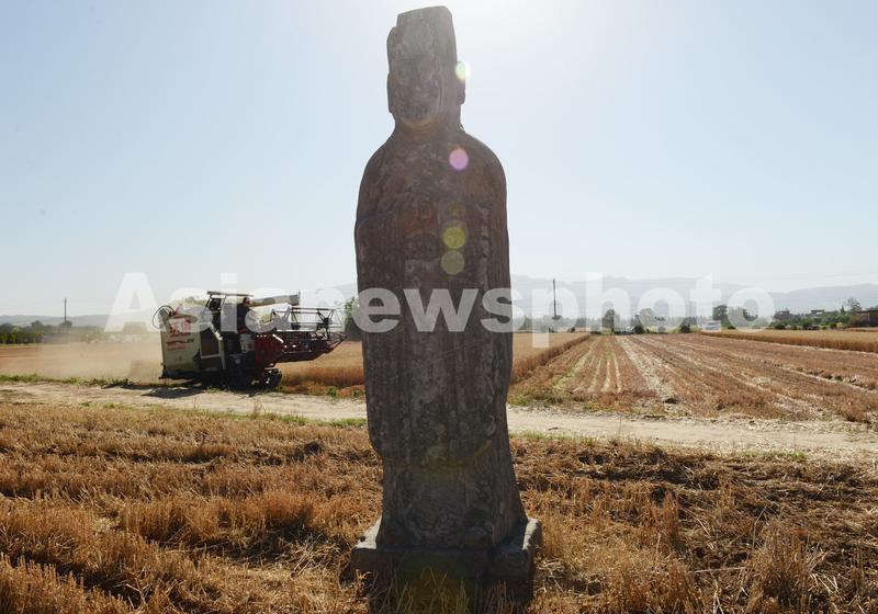 图片说明:2021年6月4日,巩义市西村镇滹沱村永熙陵,收割机在一尊石像旁收割小麦。