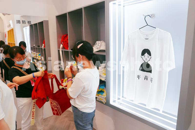 图片说明:2021年6月5日,上海,中共一大会址文创商店内的产品:《新青年》杂志主题T恤、帽子、一大会址石库门帆布袋吸引消费者。