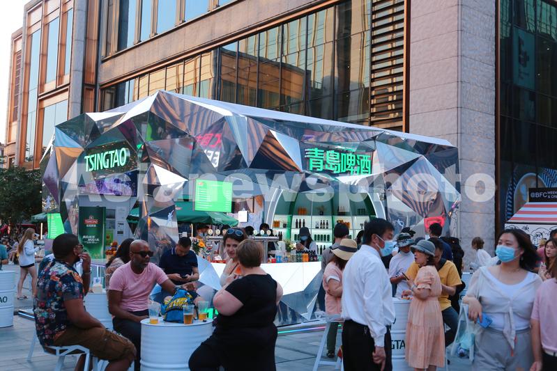 图片说明:2021年6月5日拍摄的上海外滩枫径周末集市,图为青岛啤酒快闪酒吧。