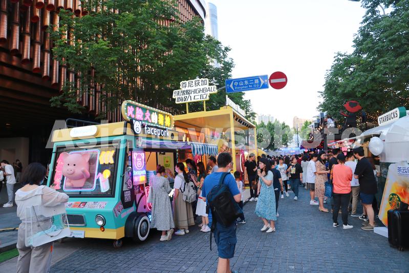 图片说明:2021年6月5日拍摄的上海外滩枫径周末集市,图为美食小吃餐车。