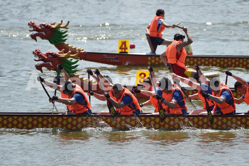 2021年6月6日,在江苏南京玄武湖,参赛龙舟队在比赛中。