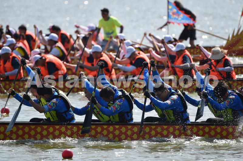2021年6月6日,在江苏南京玄武湖,参赛龙舟队在比赛中。